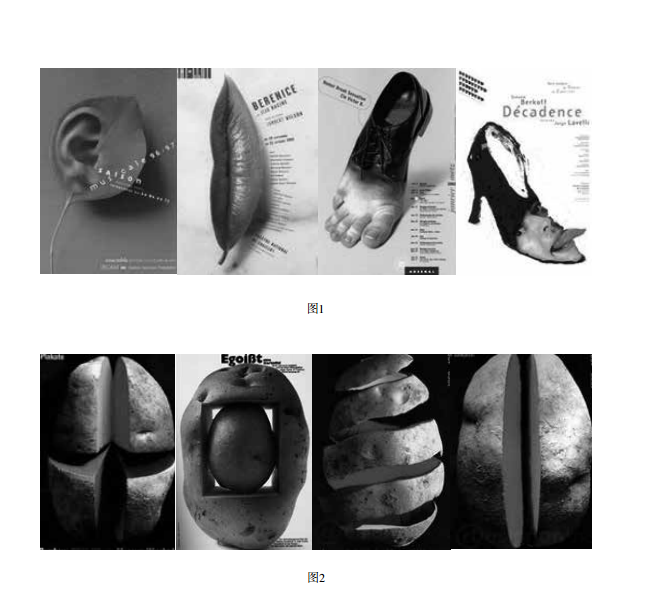 1 米荷爾·白同異招貼的最大特點就是運用特異這種奇妙的設計手法,采用攝影與電腦后期合成技術,制造出一種全新的圖形,通過極具感染力的圖形語言,給人以視覺上、心靈上的審美享受。白同異設計的一整套音樂節目季度系列海報,各種演奏的樂器作為必不可少的設計元素,制造出讓人耳目一新的視覺圖形,廣告畫面中的物件與主題沒有直接關系,但是將物件進行演變、延伸而轉化,獲得婉轉曲達的藝術效果,手法含蓄隱伏,給人以意猶未盡的感受。將象征音樂符號的綠葉與聽音樂的耳朵完美組合在一起,營造出強烈的對比意象,圖形的碰撞、質感的差異、顏色的對比,表達一種倔強而充沛的音樂情感。于是一片綠色的柳葉與紅色性感嘴唇的組合、一只黑色男式皮鞋出現的赤裸腳趾、女士高跟鞋頭出現滑稽吐著舌頭的人臉……這些都展示了他信手拈來的圖形魅力,詮釋他招貼概念的自由,使其創作更具大膽和力度。(圖1)